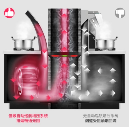 佳歌集成灶采用自動(dòng)巡航增壓科技,通過檢測和增壓的實(shí)時(shí)聯(lián)動(dòng),保證自己的煙機(jī)排風(fēng)壓高于公共煙道以及別人的排風(fēng)壓。超過420pa的排風(fēng)壓遠(yuǎn)高于公共煙道內(nèi)的高峰風(fēng)壓,確保順暢排煙。