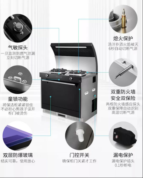佳歌集成灶七重防護(hù)功能,比如熄火保護(hù)功能可以保障在沒有人看護(hù)的情況下灶具意外熄火,可以做到秒斷氣源電源,保障廚房安全。雙重防火墻技術(shù),一左一右兩個(gè)煙道口熱感應(yīng)探頭連接防火墻溫度傳感器,雙重保險(xiǎn)杜絕隱患。