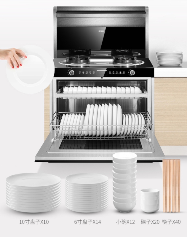 佳歌集成灶行業(yè)首創(chuàng)一門式消毒柜,佳歌集成灶的100L超大容量消毒柜,整個(gè)內(nèi)腔都可放置碗盤。可以整整放下10個(gè)10寸盤子+14個(gè)6寸盤子+12個(gè)小碗+20個(gè)碟子+40只筷子。