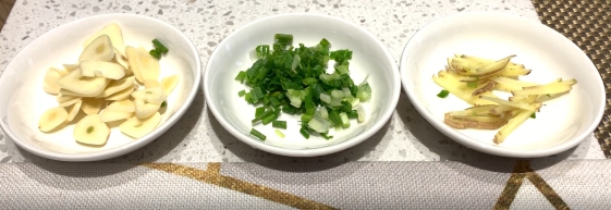 2. 蔥、姜、蒜切好備用。