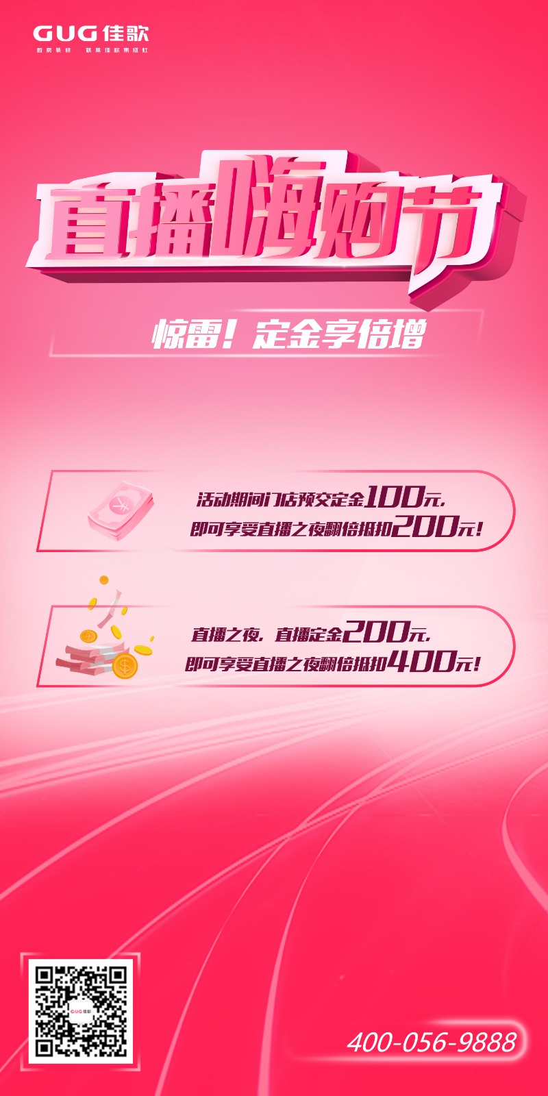 活動(dòng)期間門店預(yù)交定金100元,即可享受直播之夜翻倍抵扣200元!直播之夜支付定金200元,更可享受400元超值翻倍抵扣!