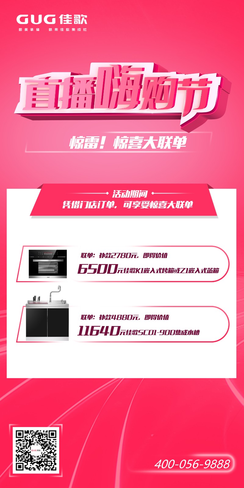 活動(dòng)期間憑借門店訂單,還可享受驚喜大聯(lián)單:補(bǔ)款2780元,即得價(jià)值6500元佳歌K1嵌入式烤箱或Z1嵌入式蒸箱;補(bǔ)款4880元,即得價(jià)值11640元佳歌SC01-900集成水槽!一次購(gòu)買,雙倍超值!