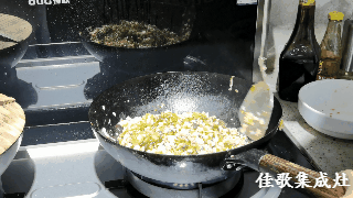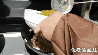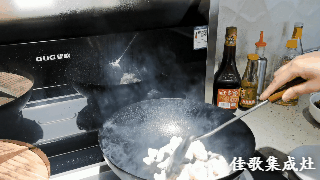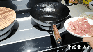 2. 打開佳歌集成灶至大火模式,將豬板油下到熱鍋,煎出豬油備用。佳歌集成灶每分鐘21立方增壓吸力,寬屏攏煙瞬吸即凈,煎炸爆炒無油煙。