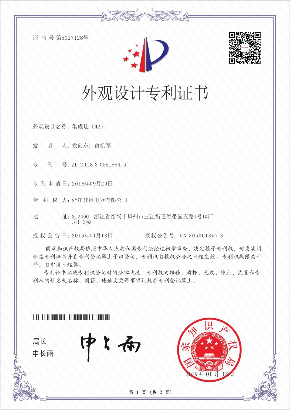 佳歌集成灶外觀設(shè)計專利