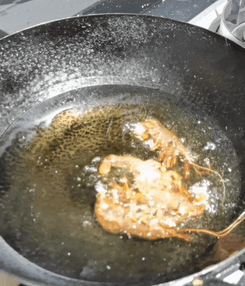 2. 用漏勺攪動(dòng)幾下讓龍蝦均勻烹炸,待龍蝦表面變紅炸至半熟后,撈出盛盤備用。