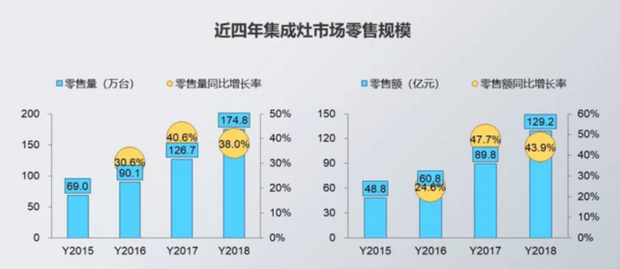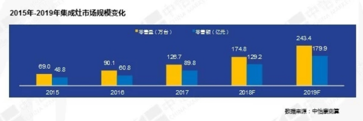 廚電產品作為每個家庭生活的必需品,目前在800億的廚電市場份額中,集成灶僅僅占據不到10%的市場份額。在過去的5年中,每年更是以接近60%的增速高速發(fā)展,其發(fā)展速度遠遠超過建材家居行業(yè)的任何一個品類,集成灶市場逐步成熟,市場規(guī)??焖僭鲩L。